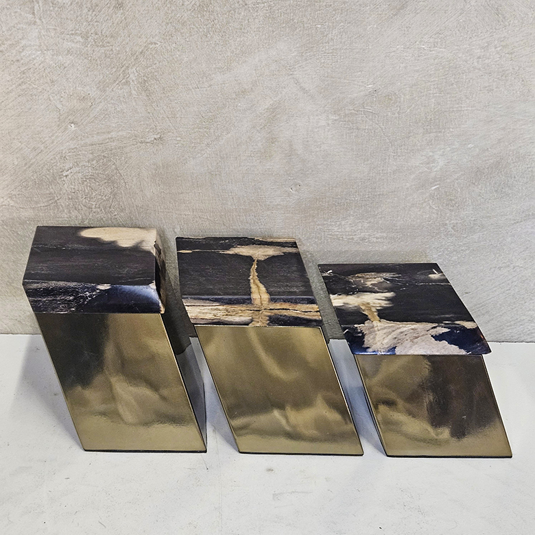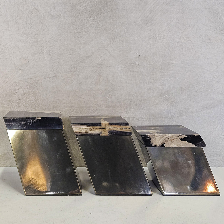 Sieradendoosjes van versteend hout met messing. Set van 3