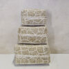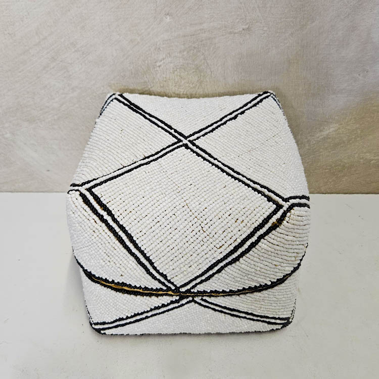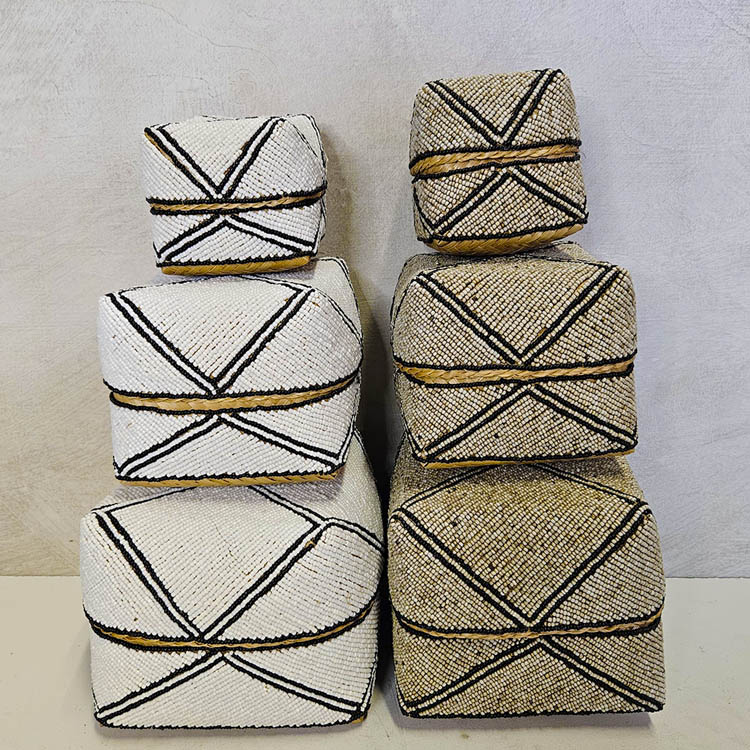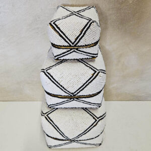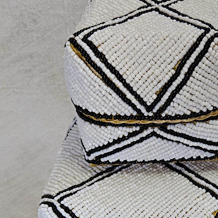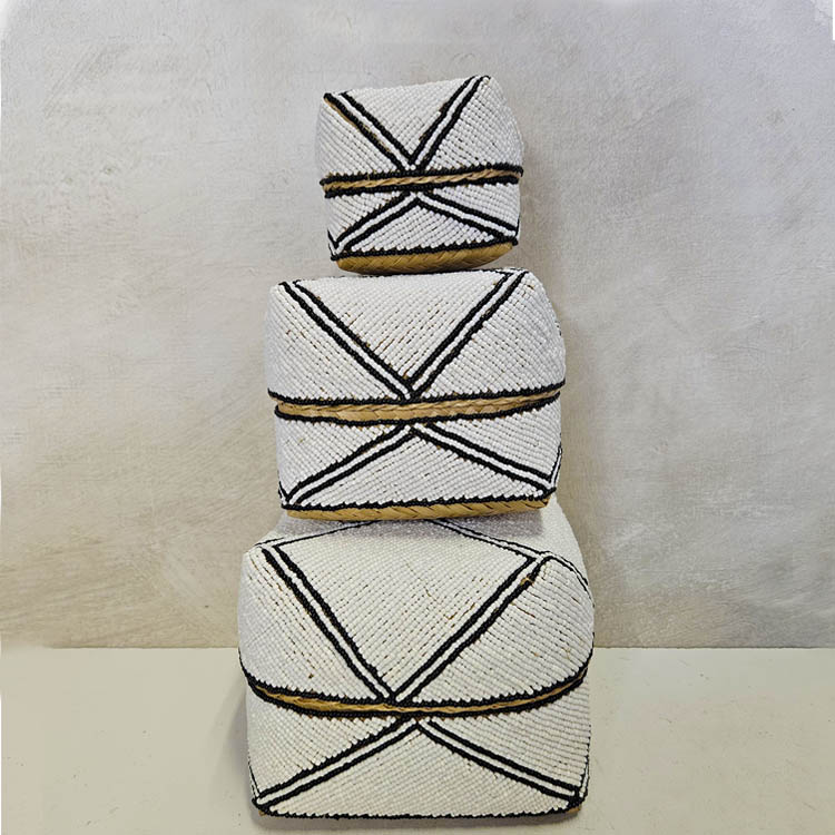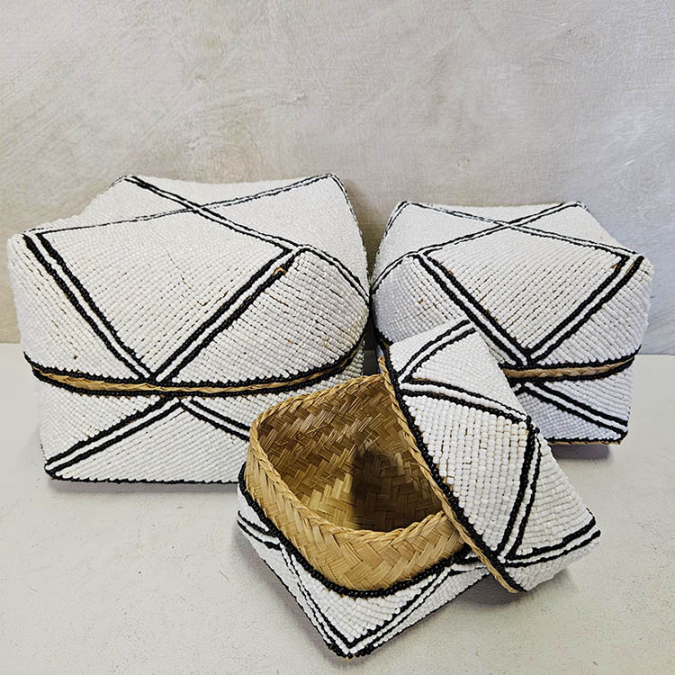 Waanzinnig mooie handgemaakte offermandjes in traditionele Balinese stijl. Gemaakt van gevlochten bamboe, versierd met kraaltjes. Set van 3.Wit/zwart van kleur