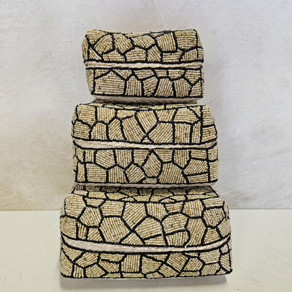 Waanzinnig mooie handgemaakte offermandjes. Gemaakt van gevlochten bamboe, versierd met kraaltjes. De mandjes zijn crème met een zwart patroon. Set van 3.