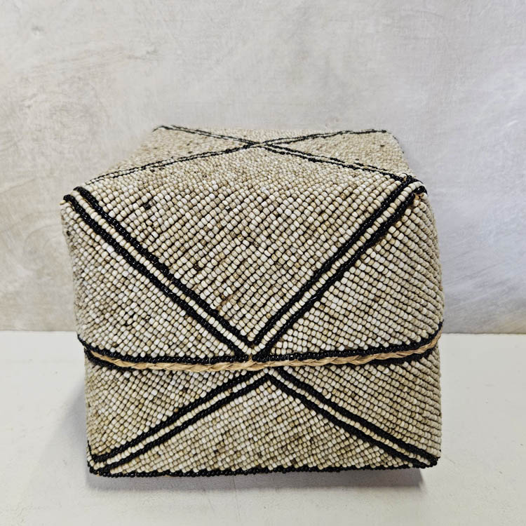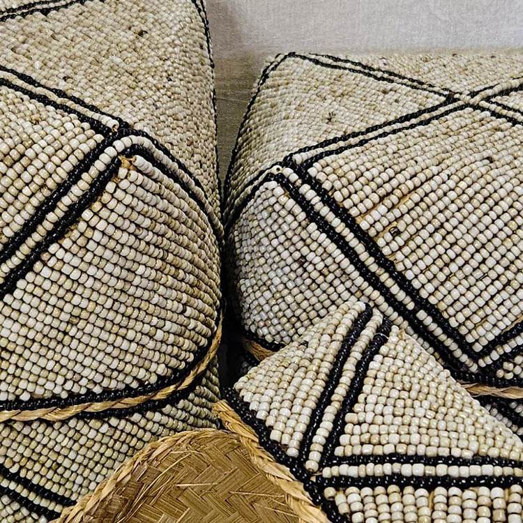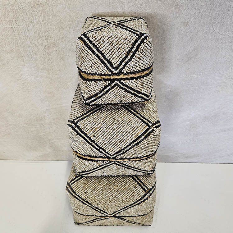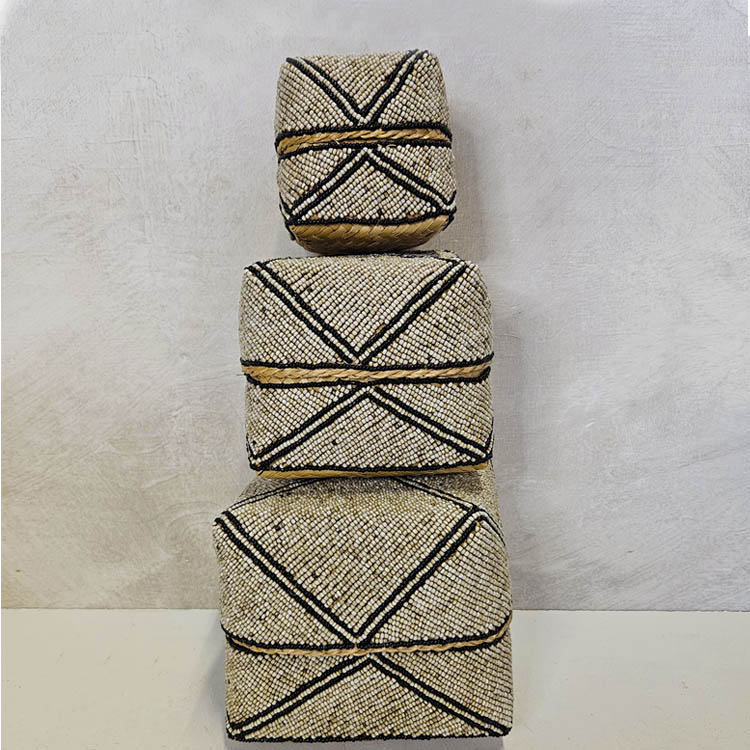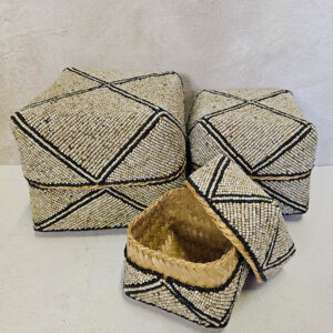 Waanzinnig mooie handgemaakte offermandjes in traditionele Balinese stijl. Gemaakt van gevlochten bamboe, versierd met kraaltjes. Set van 3. Beige/zwart van kleur