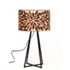 Deze stoere tafellamp heeft een kap gemaakt van schelpen en een zwart metalen voetje. De kleuren van de kap zijn een mix van crème, bruin en goud.