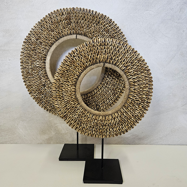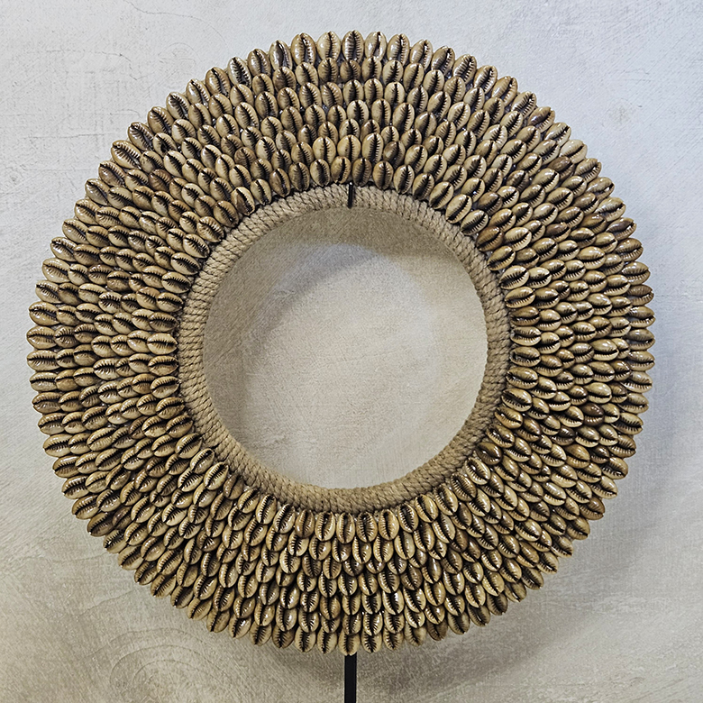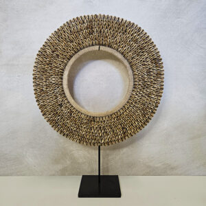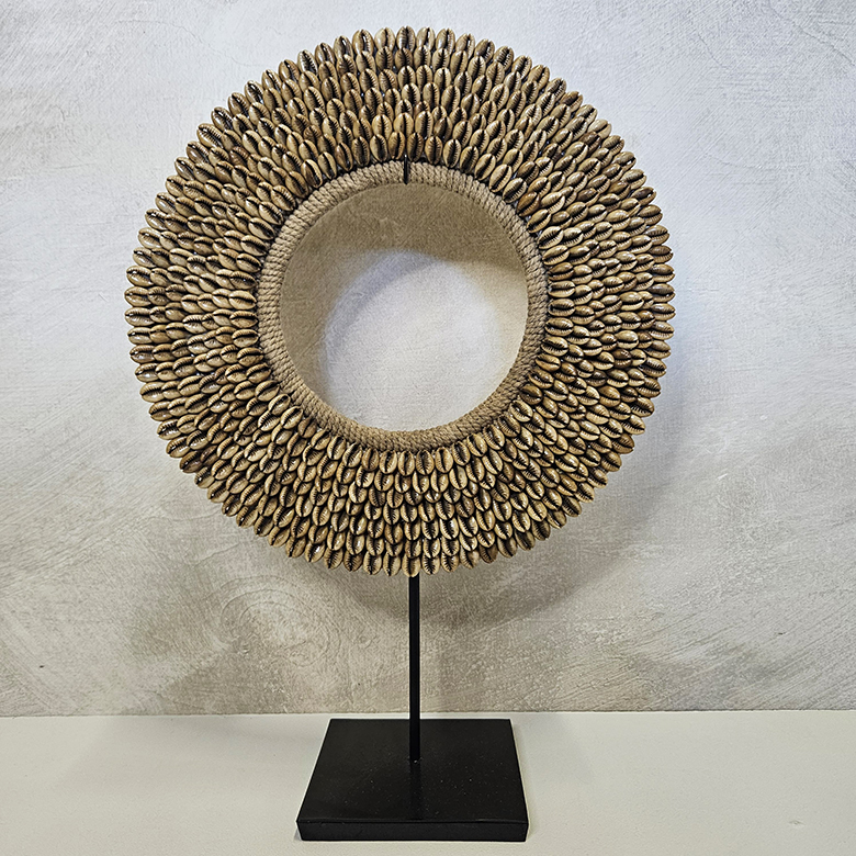 Schelpenstandaard met buine kauri schelpen. De decoratie is inclusief zwart metalen standaard. Verkrijgbaar in 2 maten