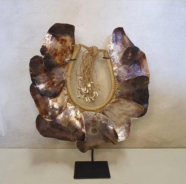 Een prachtige kraag, handgemaakt van paarse schelpen, waarmee jij je woon- of slaapkamer helemaal in stijl brengt. De kraag is inclusief zwart metalen standaard.