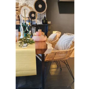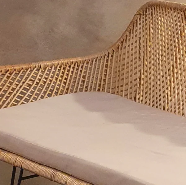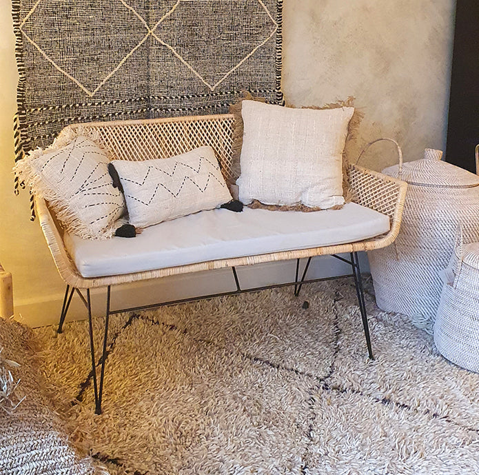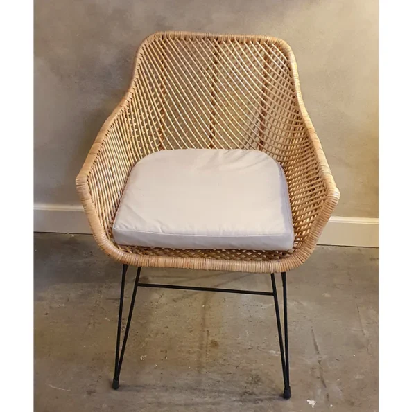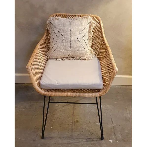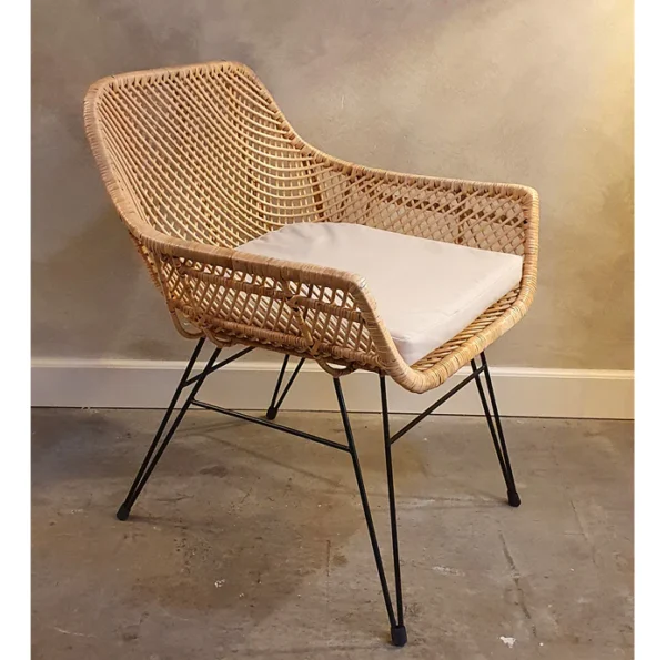 Simpele, maar stijlvolle stoel van gevlochten rotan. Het frame is gemaakt van zwart metaal. De stoel is met de hand gemaakt in Indonesië en wordt geleverd met een licht beige kussen. We hebben in deze stijl ook een bijpassend bankje