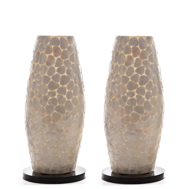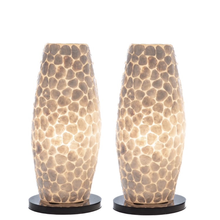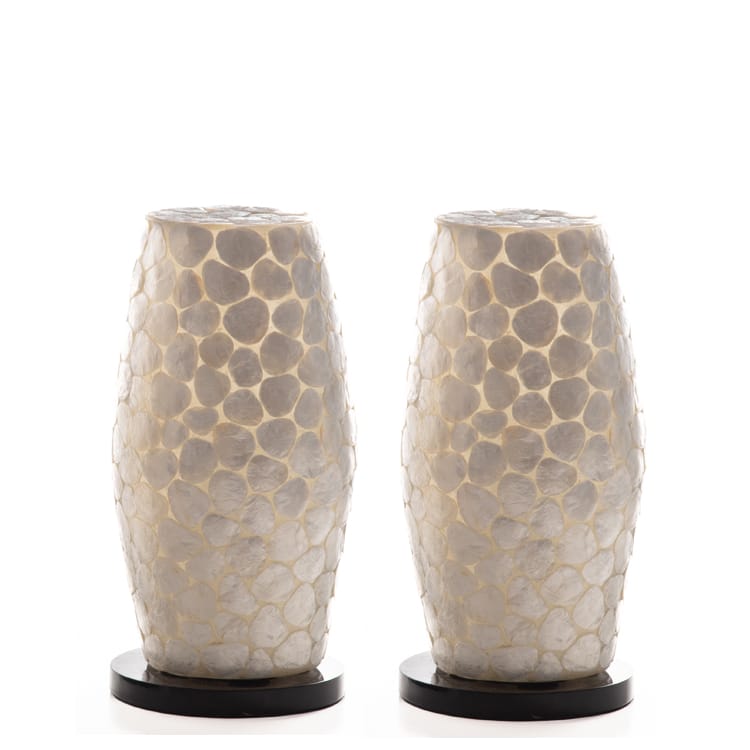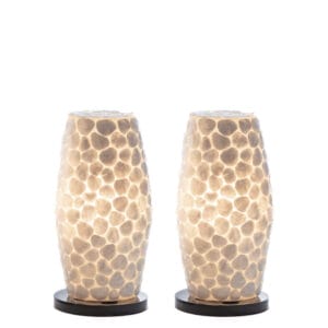 2 sfeervolle tafellampjes in 30 of 40 cm. De lampjes zijn wit/parelmoer als ze uit staan, maar als ze aan staan geven ze een warm, crème kleurig licht. De lamp wordt geleverd met een zwart eurosnoer met handschakelaar en heeft een E14 fitting. Deze set bestaat uit 2 lampen, ze zijn niet los te verkrijgen.