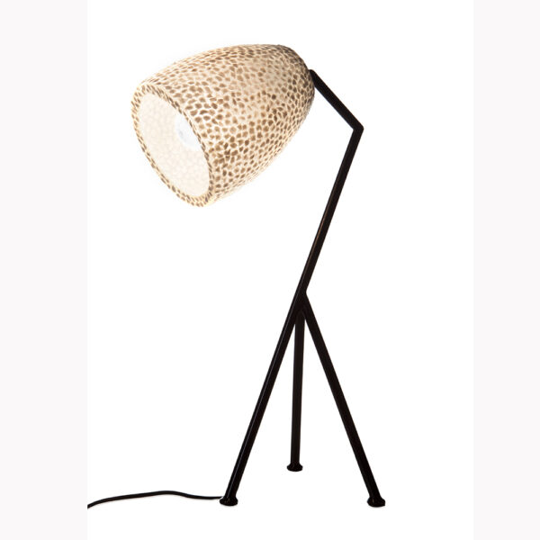 Deze stoere tafellamp heeft een kap gemaakt van schelpen en een zwart metalen voetje. De lamp is wit/parelmoer als hij uit staat, maar als hij aan staat geeft hij een warm, crème kleurig licht.